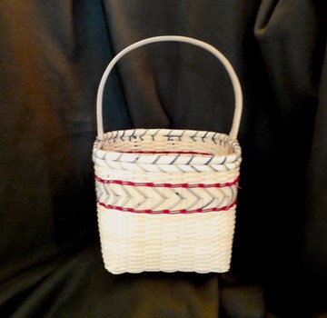 This basket has a nice rounded shape. Not only is it just a little bit of a challenge to weave and shape but also fun! Continuous weave accented with an arrow design using dyed cane and topped with a beautiful hand carved handle make this basket a winner! The finished size of this basket is approximately 10" by 11.5" by 8.5" tall without the handle.